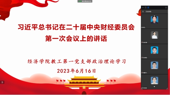 2023年5月5日,习近平总书记主持召开二十届中央财经委员会第一次会议并发表重要讲话。为深入领会习近平总书记重要讲话精神,贯彻落实党中央经济工作部署,体现新时代哲学社会科学研究工作者的责任担当,为助力中国式现代化建言献策,304永利集团官网入口教工第一支部于2023年6月16日,通过在线形式集体学习本次会议内容。