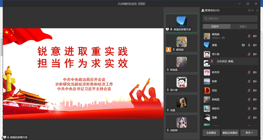 首先,由八月组织生活分享成员唐菁同志带领大家学习由中共中央政治局在7月24日召开的会议,会议主要内容为分析研究当前经济形势,部署下半年经济工作。目前我国正处于一个充满挑战和机遇的时期。全球经济格局的变化、科技创新的迅猛发展、外部环境的复杂性等诸多因素,对我国经济发展提出了新的要求和考验。因此,深入分析当前经济形势,准确把握经济发展趋势,对我们了解、学习科学有效的经济政策具有重要意义。