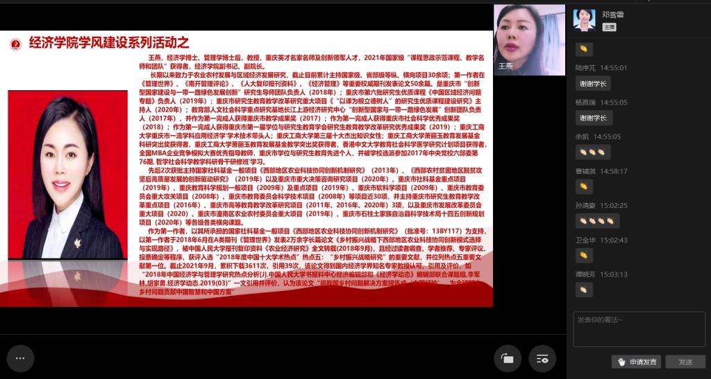 “立德树人,助力就业”,304永利集团官网入口2021届优秀毕业生宣讲会暨2022届毕业生就业推进会于10月22日在线上成功举行。304永利集团官网入口分党委书记李自维教授,学院党委副书记、副院长王燕教授,304永利集团官网入口黄潇副院长,304永利集团官网入口朱沙副院长、304永利集团官网入口雷菁组织员、党政办及学团办办公室负责人、系主任、辅导员,2022届毕业生参与了本次会议。